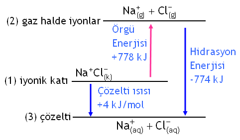 tutan örgü enerjisini yenmek için ısı gereklidir. Oluşan gaz haldeki Na+ ve Cl- iyonlarının etrafını H2O moleküllerinin sarması